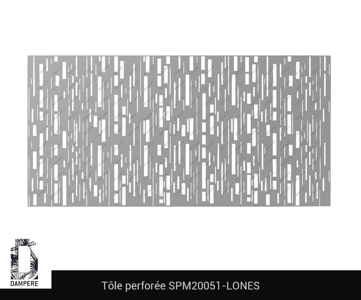 La tôle décorative Lones DAMPERE représente des grandes ouvertures rectangulaires, disposées verticalement tels des bâtonnets, dans un dynamisme intense pour accentuer la composition aléatoire. Les fines fentes posées à côté de larges échancrures relèvent le contraste dans la transparence. Le ratio largeur par hauteur des formes rectangulaires permet d’obtenir des formes effilées, volontairement écartées des proportions d’un carré, permettant de conserver un motif léger. La tôle décorative Lones DAMPERE se distingue par ses ouvertures rectangulaires verticales qui forment un motif à la fois dynamique et fluide. Les bâtonnets fins et longs sont juxtaposés à des échancrures plus larges, offrant un jeu de contraste subtil entre transparence et opacité. L'agencement aléatoire des découpes laser crée une composition vibrante, accentuant l'impression de mouvement et de légèreté du moucharabieh métallique. L’aspect graphique des formes effilées permet à la lumière de passer à travers les ouvertures rectangulaires, créant des jeux d’ombres et de lumières variables selon l’heure de la journée. Cette alternance d’ouvertures plus larges et de fines fentes renforce l'impact visuel tout en conservant une certaine élégance. Ce ratio de largeur par hauteur, volontairement déséquilibré, empêche le motif de devenir trop rigide ou statique, et contribue à sa légèreté visuelle. La tôle découpée sur mesure Lones est idéale pour des applications telles que des clôtures, des garde-corps, ou des brise-vue, où la transparence doit être modulée sans occulter complètement l'espace. Ce design est particulièrement recommandé pour des projets qui nécessitent une solution contemporaine, capable de dynamiser une façade ou de moderniser un espace tout en laissant passer l'air et la lumière. Grâce à son effet graphique intense et à ses formes verticales élancées, elle permet d’ajouter du mouvement et une dimension sculpturale à l’environnement urbain ou architectural où elle est installée.