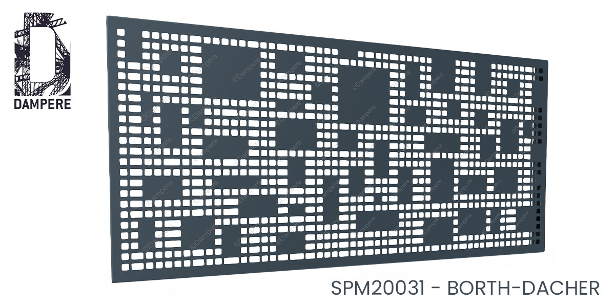 La tôle perforée décorative Borth Dacher DAMPERE est idéale pour le remplissage de garde-corps de balcon, offrant un équilibre unique entre opacité et transparence. Son motif décoratif se compose de grands volumes rectangulaires opaques, qui assurent une intimité renforcée pour les occupants du balcon. Ces formes solides sont agrémentées de perforations carrées aléatoires, réalisées de manière pixélisée, ce qui ajoute un dynamisme visuel au design tout en permettant à la lumière de traverser certaines zones du panneau. La combinaison de volumes rectangulaires pleins et de perforations aléatoires crée un contraste entre des zones totalement occultées et des espaces partiellement ajourés. Cette structure graphique garantit à la fois la sécurité du garde-corps et un apport de lumière naturelle. Les perforations aléatoires permettent de laisser passer la lumière de manière irrégulière, générant des ombres et des projections lumineuses de pénombre qui évoluent au fil de la journée. Cet effet anime l’espace du balcon tout en apportant une touche artistique. Le design pixélisé et aléatoire confère un aspect contemporain au garde-corps, tout en restant discret et fonctionnel. Il s'intègre parfaitement dans des environnements urbains ou résidentiels modernes, apportant un look sophistiqué et minimaliste. La tôle perforée Borth Dacher est conçue pour garantir la solidité et la durabilité du garde-corps, tout en offrant une esthétique épurée. Les volumes opaques assurent une protection optimale contre les chutes, tandis que les perforations, bien que décoratives, ne compromettent en rien la sécurité du balcon. Ce remplissage est ainsi un choix idéal pour les projets architecturaux contemporains recherchant une combinaison de design, de sécurité et de lumière.Usages