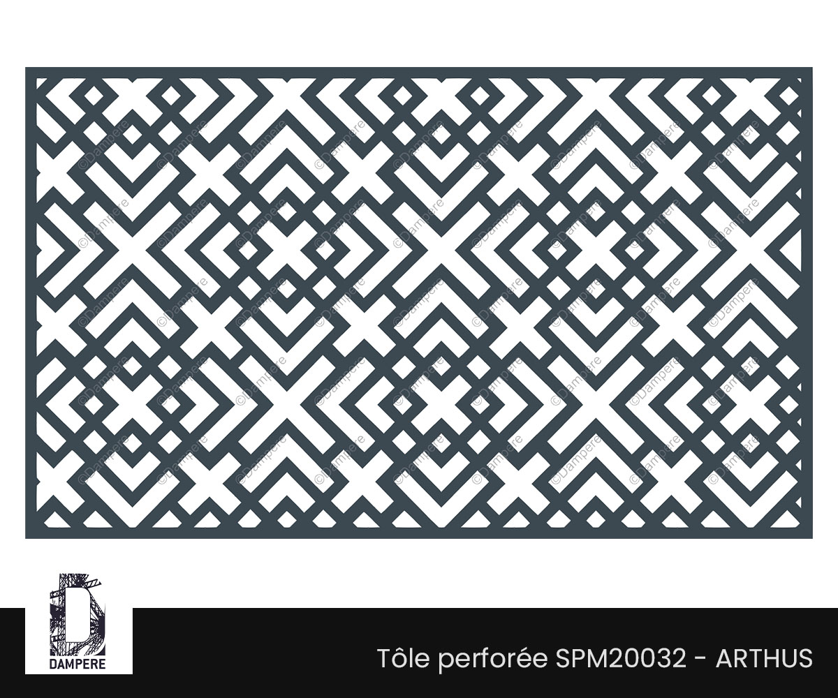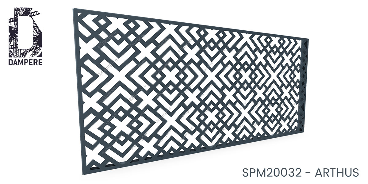 La tôle en découpe laser Arthus DAMPERE, adaptée à l'univers de la clôture, se démarque par son motif raffiné et contemporain, constitué de croix entremêlées de tailles variées. Ces croix se superposent et fusionnent selon un schéma en damier diagonal, formant une structure ajourée qui allie esthétique et solidité. Ce motif géométrique donne à la clôture un effet visuel dynamique tout en maintenant une protection sécuritaire contre les intrusions. Grâce à une transparence de plus de 50%, la tôle Arthus permet à la lumière de filtrer à travers les perforations, créant des jeux d'ombres subtils qui évoluent au fil de la journée, tout en préservant une sensation d’ouverture et de légèreté visuelle. Utilisée dans un projet de clôture, la tôle Arthus introduit une touche d'élégance moderne qui s'intègre parfaitement dans des jardins ou espaces publics, tout en assurant un bon niveau d’intimité et de sécurité. Le design entrelacé et ajouré permet une vue dégagée, tout en ajoutant une barrière esthétique. Ce moucharabieh métallique est un excellent choix pour des clôtures, apportant à la fois une apparence contemporaine et un effet fonctionnel harmonieux, particulièrement adapté pour les parcs, jardins ou autres aménagements extérieurs où l’esthétique doit rimer avec protection.Usages